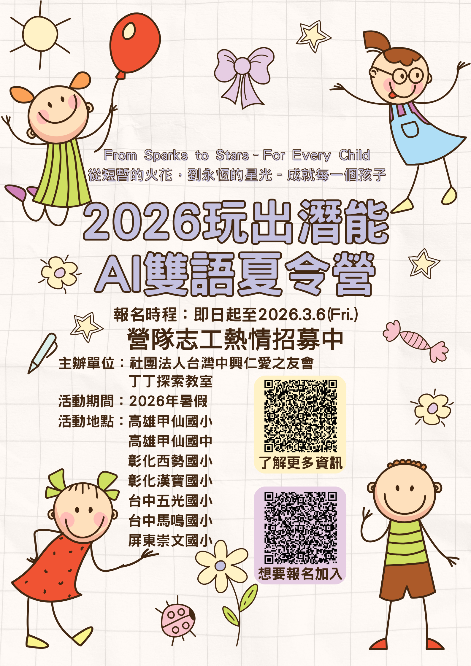 中興仁愛之友會將在2026年暑假辦理一系列「2026玩出潛能AI雙語夏令營」,正在尋找有服務熱忱的你/妳,快點擊下方連結,或掃描QR code了解更多資訊,期待每一位志同道合的夥伴加入!