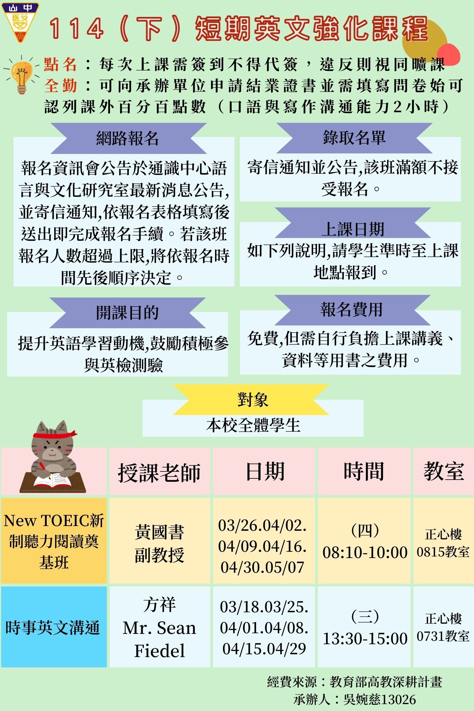 114(下)短期英語強化課程上課教室資訊