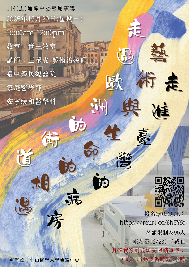 114/12/29(一)通識中心專題講座-走過歐洲的街道、走進臺灣的病房:藝術與生命的相遇(即日起報名至12/23(二)截止)