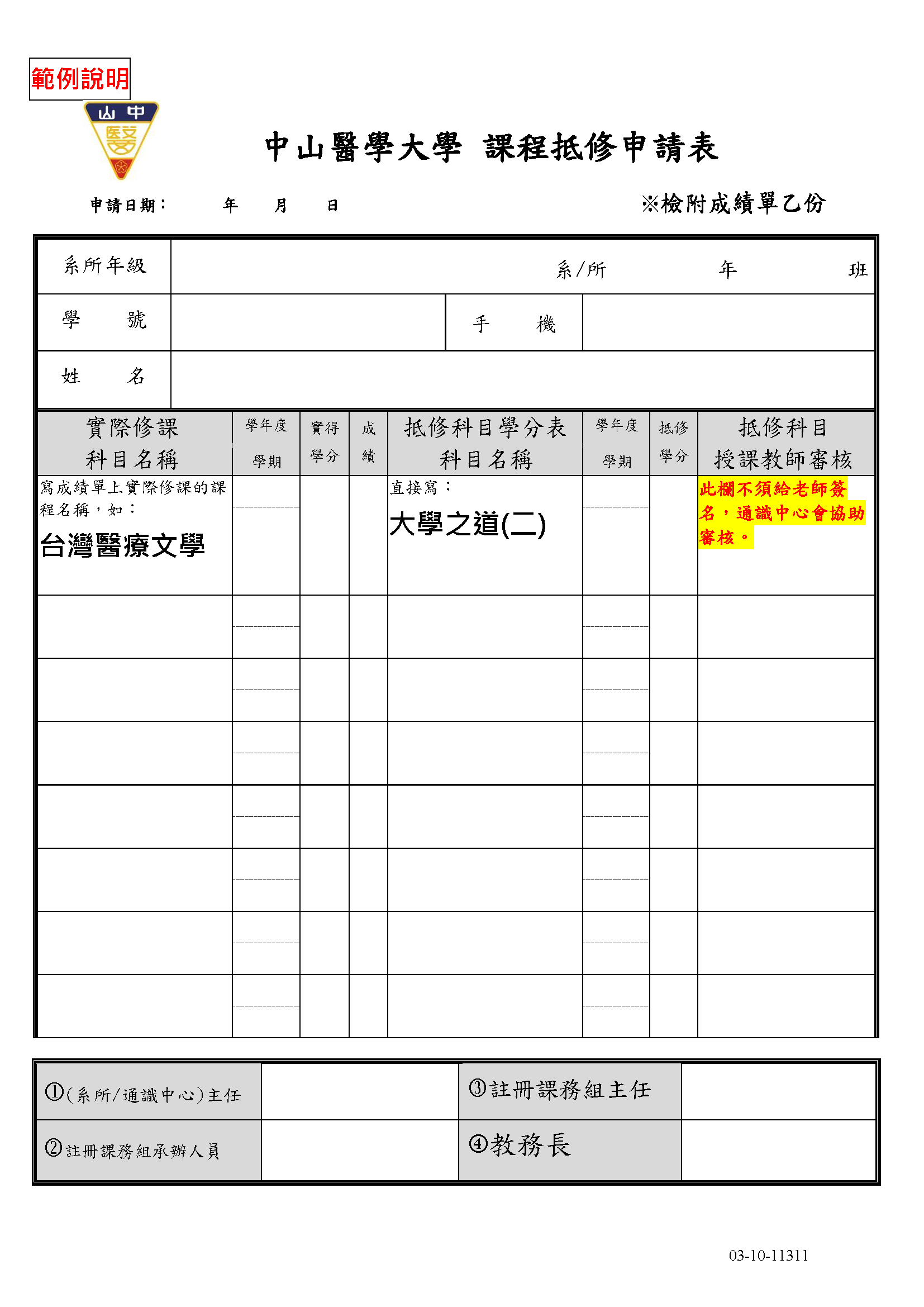 課程抵修表單:https://oaa.csmu.edu.tw/var/file/9/1009/img/1760/912554976.pdf